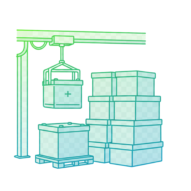 Das Herzstück der physischen Infrastruktur ist unser automatisiertes Blocklagersystem. Hier werden die Batteriewannen mithilfe eines deckengeführten Kransystems eingelagert, gestapelt und bei Bedarf punktgenau wieder entnommen. Jede Bewegung wird digital erfasst, dokumentiert und in einem zentralen System verwaltet. So lassen sich einzelne Batterien gezielt ansteuern, um Wartung, Austausch oder gezielte Einspeisung zu ermöglichen. Durch die Automatisierung können große Mengen Batterien effizient gehandhabt werden, bei gleichzeitig minimalem Personalaufwand. Das spart Kosten, Zeit und macht den Betrieb skalierbar.